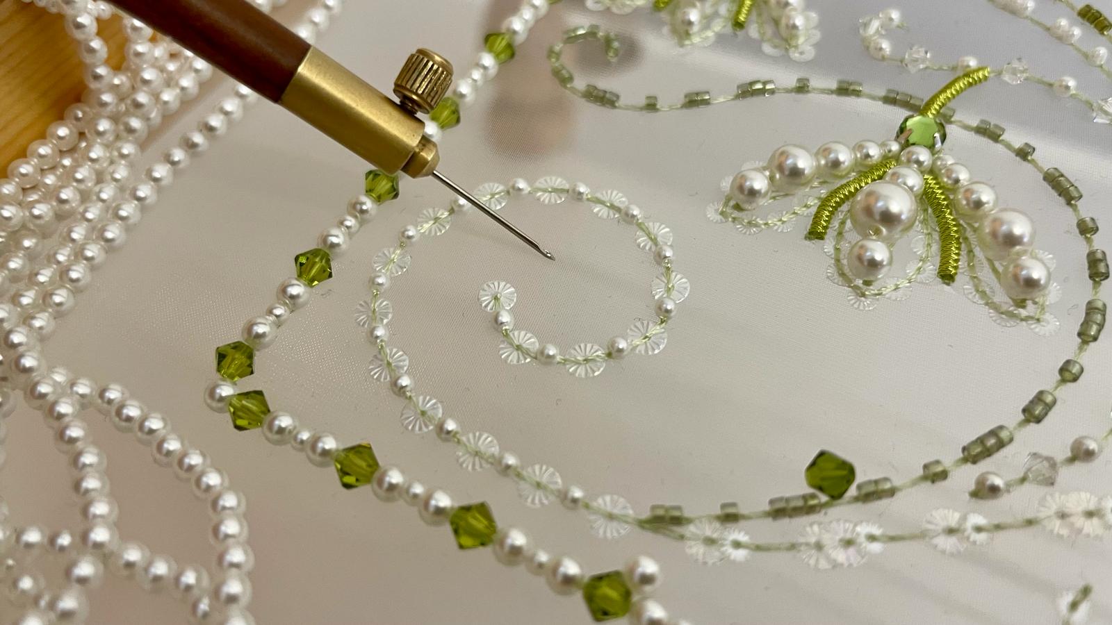 Gain knowledge of all the processes, techniques and materials involved in creating a couture beaded design with tambour. You will create a Beauvais stitch, attach beads, sequins, rhinestones and goldwork all using a tambour hook.